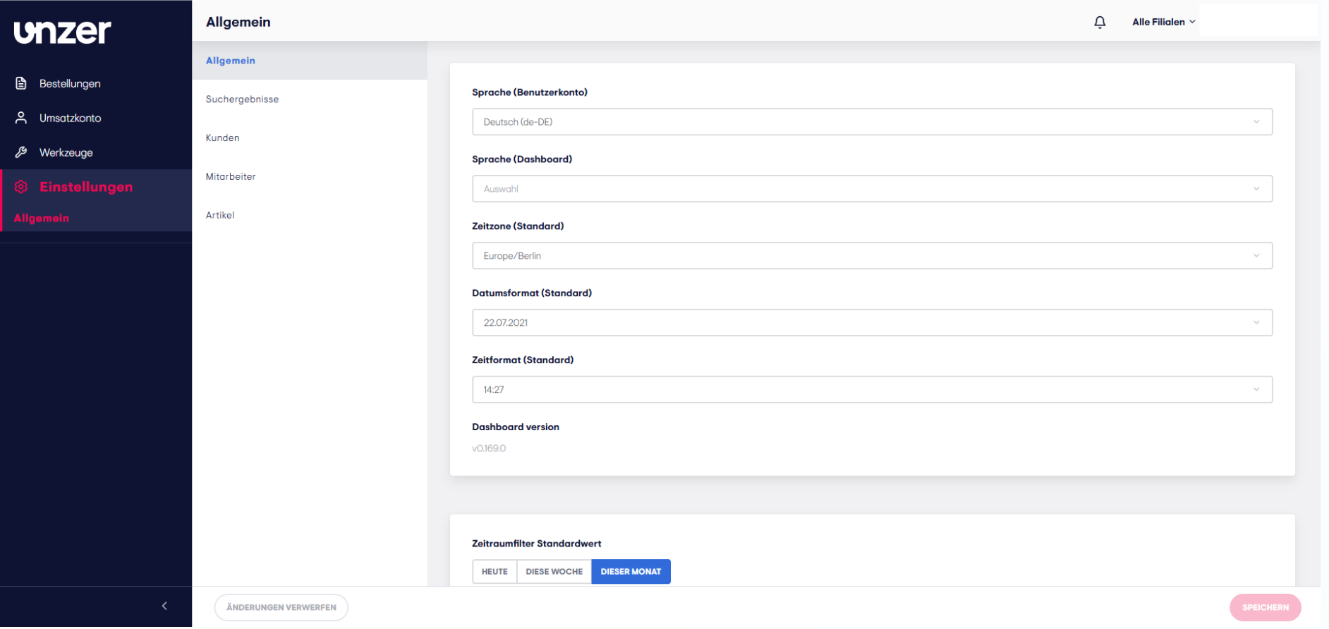 Sie können Ihr UnzerOne-Dashboard ganz einfach an Ihre Bedürfnisse anpassen, indem Sie Sprache, Zeitzone, Datums- und Zeitformat sowie den Standardzeitraum für die Anzeige von Transaktionen einstellen.
