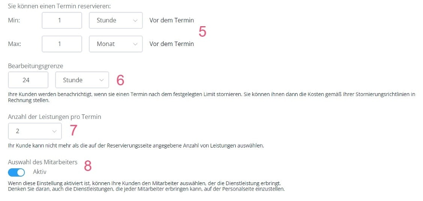 - Wählen Sie den minimalen und maximalen Vorlauf, innerhalb dessen Termine gebucht werden können.