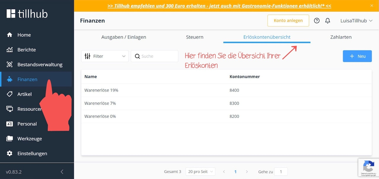 Unter dem Reiter "Erlöskontenübersicht" finden Sie folgende Erlöskonten: