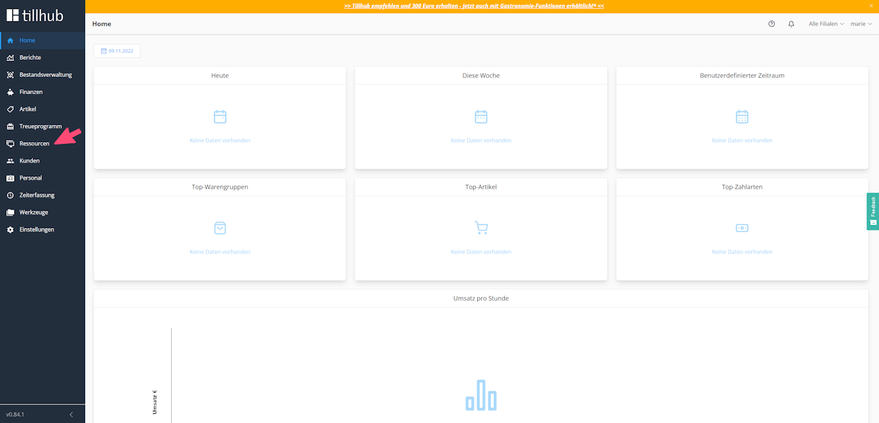 Navigieren Sie im ersten Schritt zum Tillhub Dashboard: https://dashboard.tillhub.com/home, und klicken Sie auf den Button "Ressourcen".