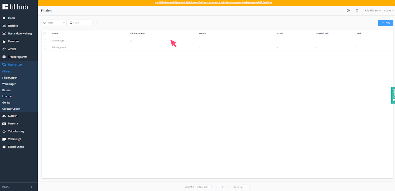 Klicken Sie auf die angelegte Filiale (in die Zeile und nicht auf das Auswahlkästchen am linken Rand).