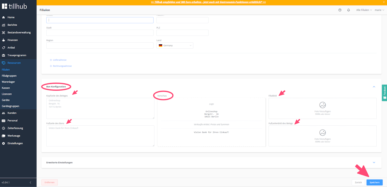 In diesem Abschnitt erklären wir Ihnen, wie Sie Ihren Kassenbon konfigurieren und weitere Filialen in Ihrem Dashboard-Account anlegen können.