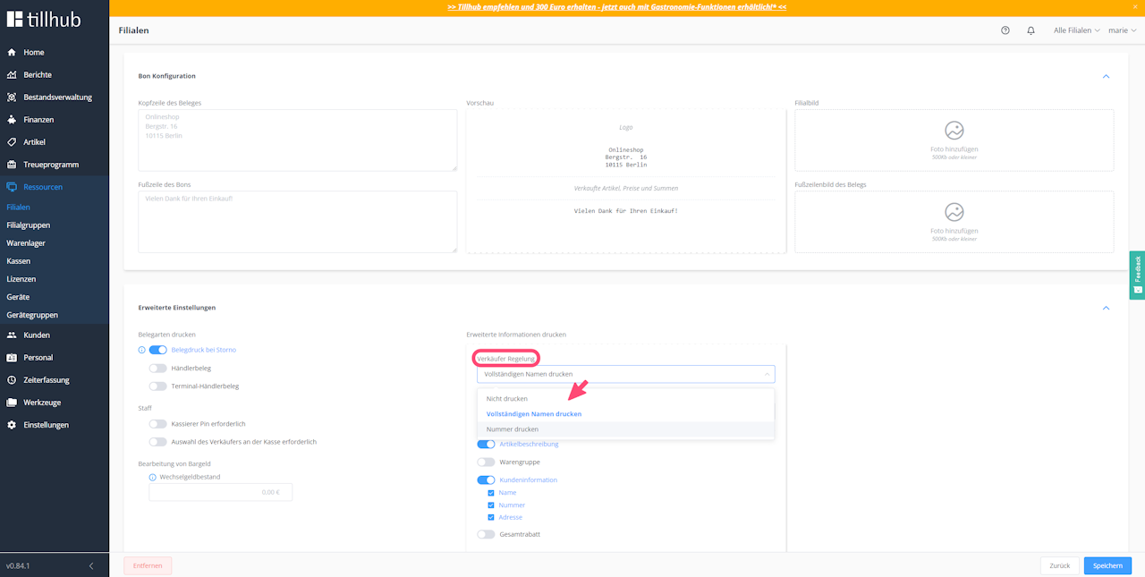 Im Menübereich "Erweiterte Einstellungen" haben Sie auf der rechten Seite unter "Verkäufer Regelung" die Möglichkeit zu entscheiden, welche Informationen zum Verkäufer auf dem Kassenbon abgedruckt werden sollen: