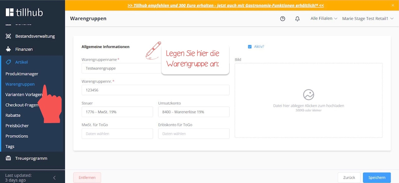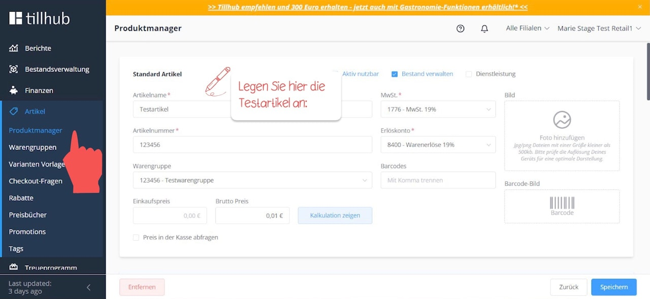 Testartikel und -warengruppe anlegen
