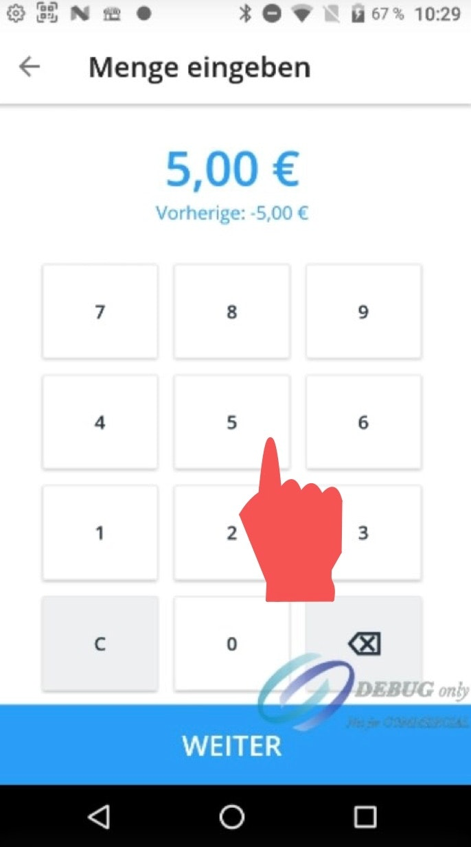 Tippen Sie auf "Menge" und geben Sie über das Zahlenfeld den Betrag ein, den Sie an die Bank buchen möchten. Bestätigen Sie Ihre Angabe mit "Weiter".
