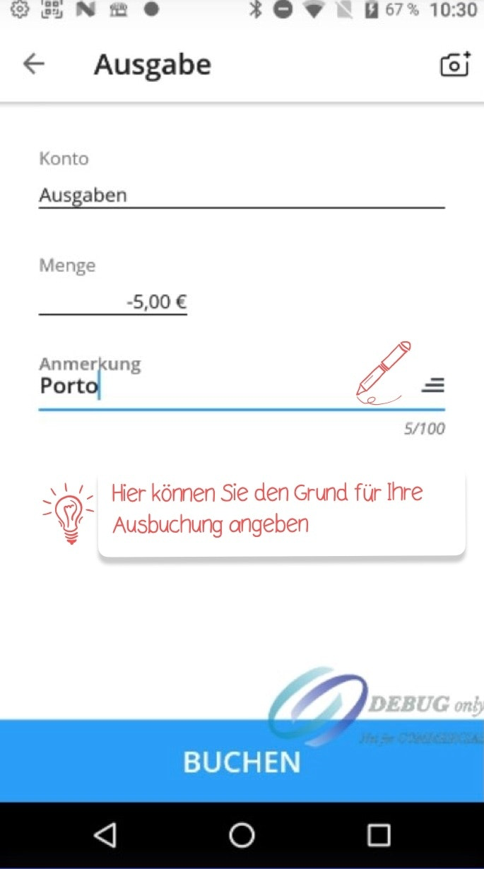 Fügen Sie in das Kommentarfeld den Grund für Ihre Ausbuchung ein, wie z.B. "Porto-Rechnung". Klicken Sie abschließend im nächsten Fenster auf "Buchen".