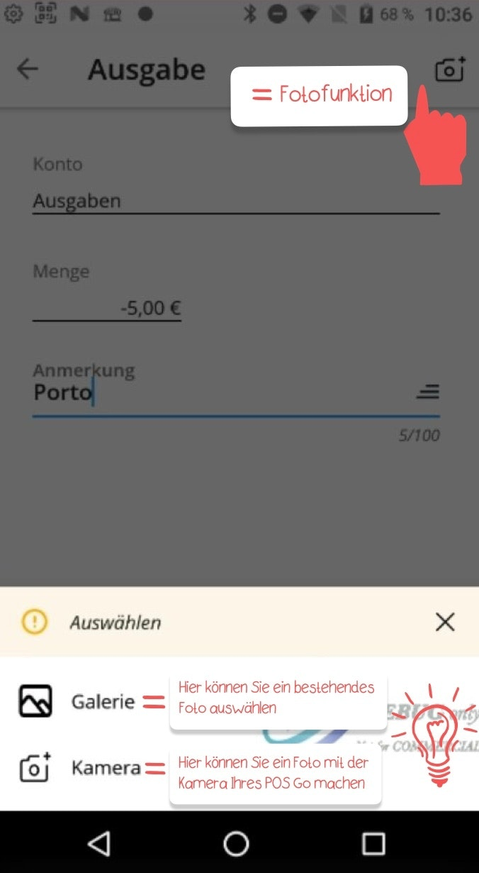 Nun haben Sie folgende zwei Möglichkeiten: Sie können entweder "Kamera" auswählen und ein Foto des Belegs mit der Kamera Ihres POS Go machen oder auf "Galerie" tippen und ein bestehendes Fotos aus Ihrer Bilder-Galerie auswählen.