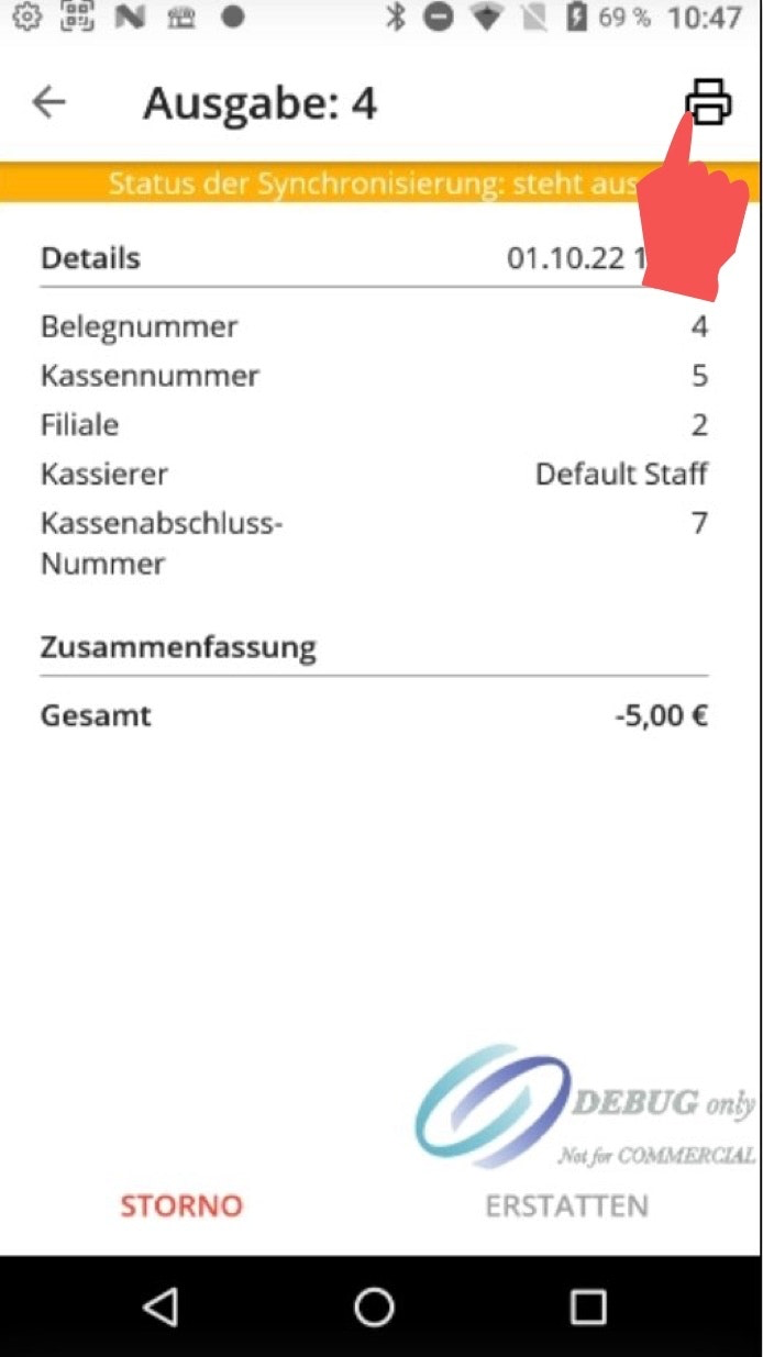 Wählen Sie den jeweiligen Ausgabenbeleg aus und tippen Sie auf das Druckersymbol oben rechts, um diesen nochmalig auszudrucken (Bild 3).