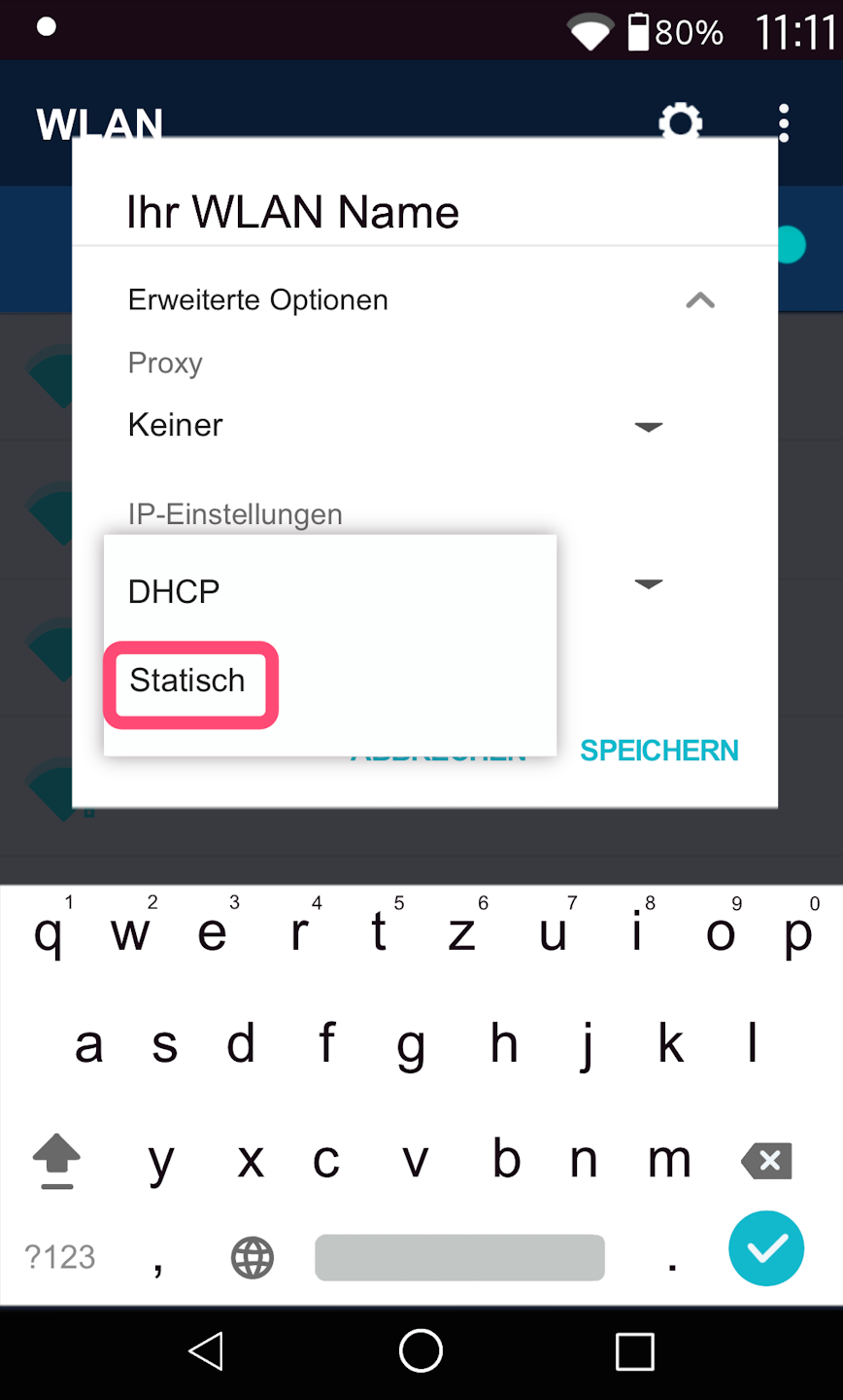 Abb. 3 - Im unteren Bereich finden Sie die IP-Einstellungen. Im Standard ist DHCP eingestellt. Bitte tippen Sie DHCP an.