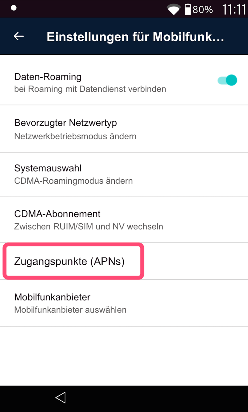 Abb. 1 - Bitte tippen Sie die Zugangspunkte (APNs) an. Hier legen wir nun fest, über welchen Zugangspunkt sich die SIM-Karte einloggt. Wie in Abb. 2 zu sehen, tippen Sie bitte oben rechts das Plus Symbol an.