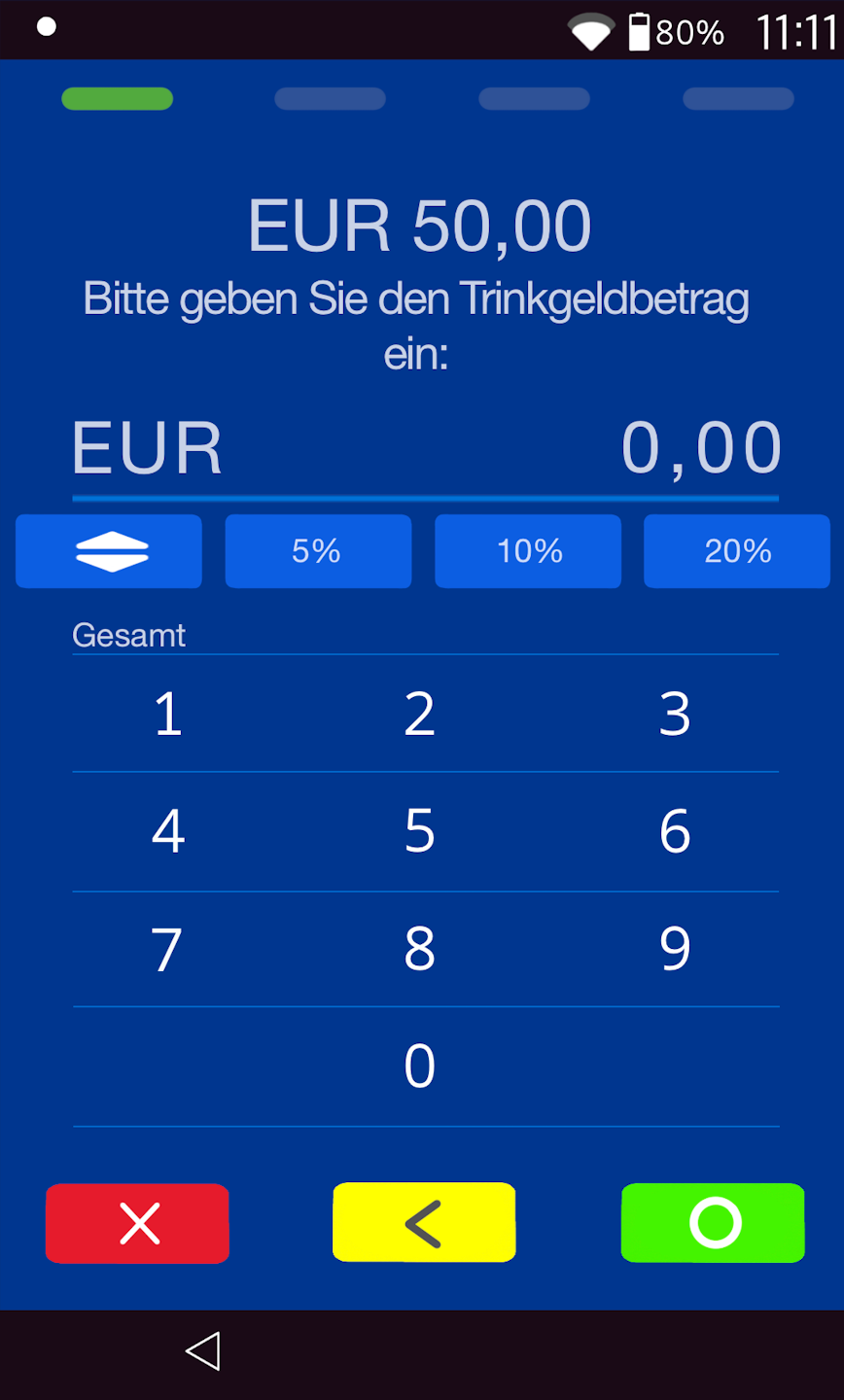 - prozentuale und manuelle Trinkgeldabfrage möglich