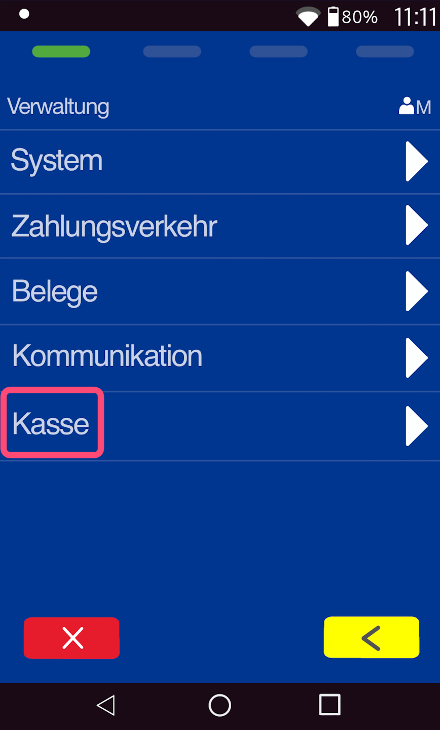 Navigieren Sie bitte, wie in Abb. 1 gezeigt, zum Menüpunkt Verwaltung und danach zum Menüpunkt Kasse (Abb. 2).