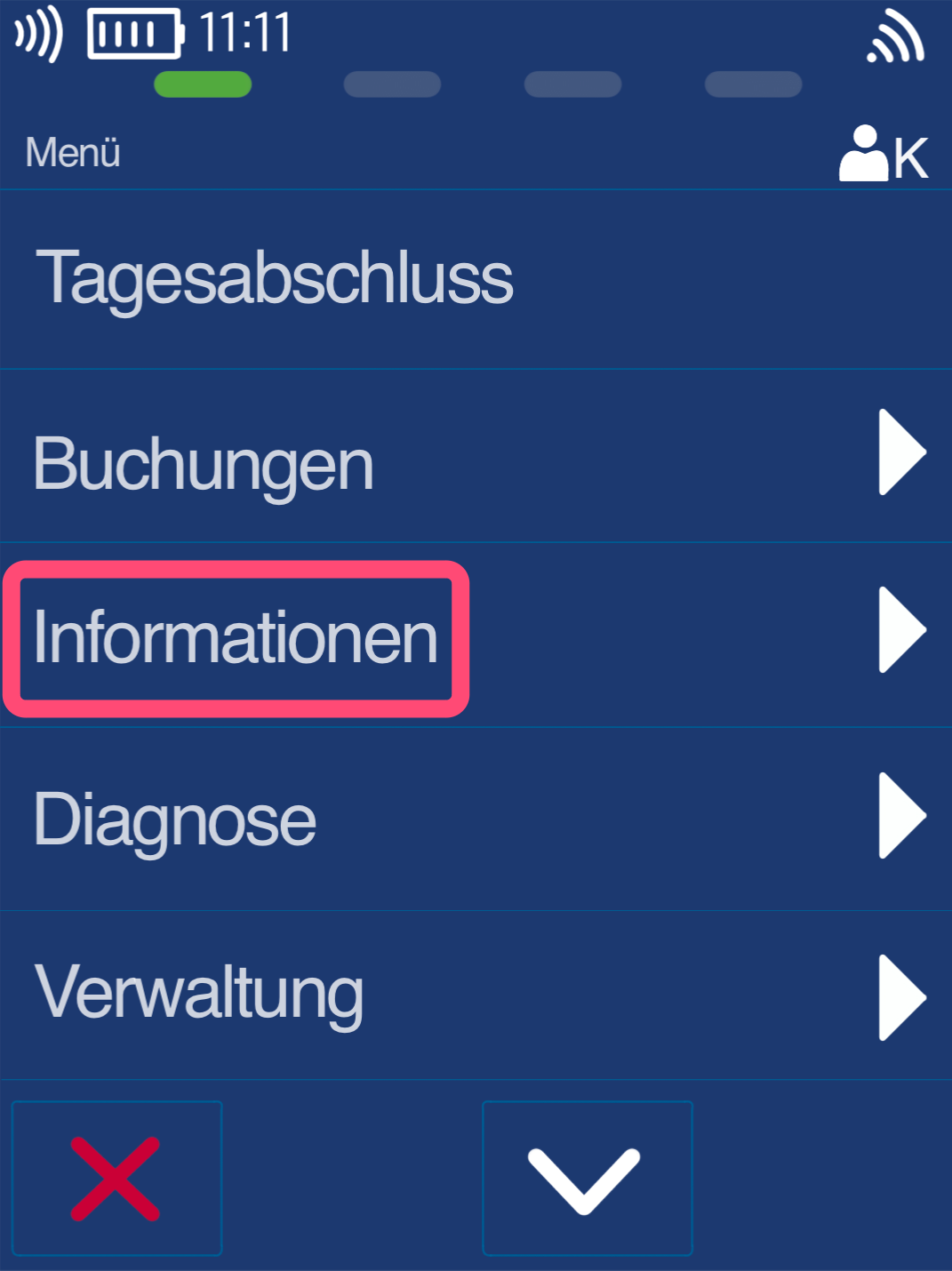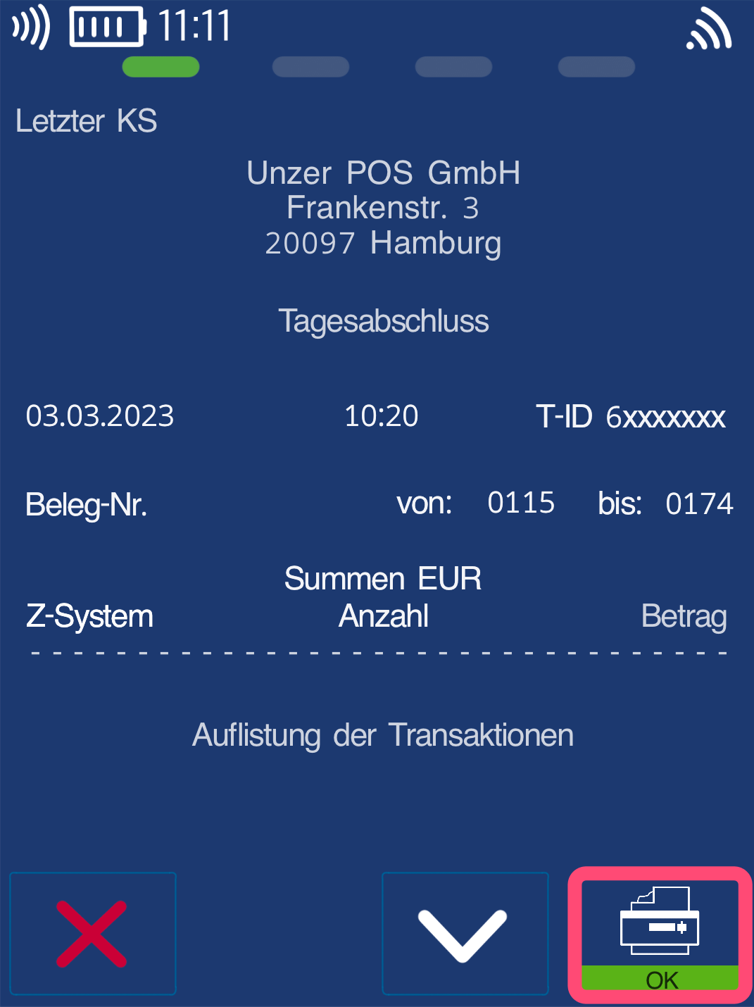 Nun erhalten Sie eine Anzeige des letzten Kassenschnittes.
