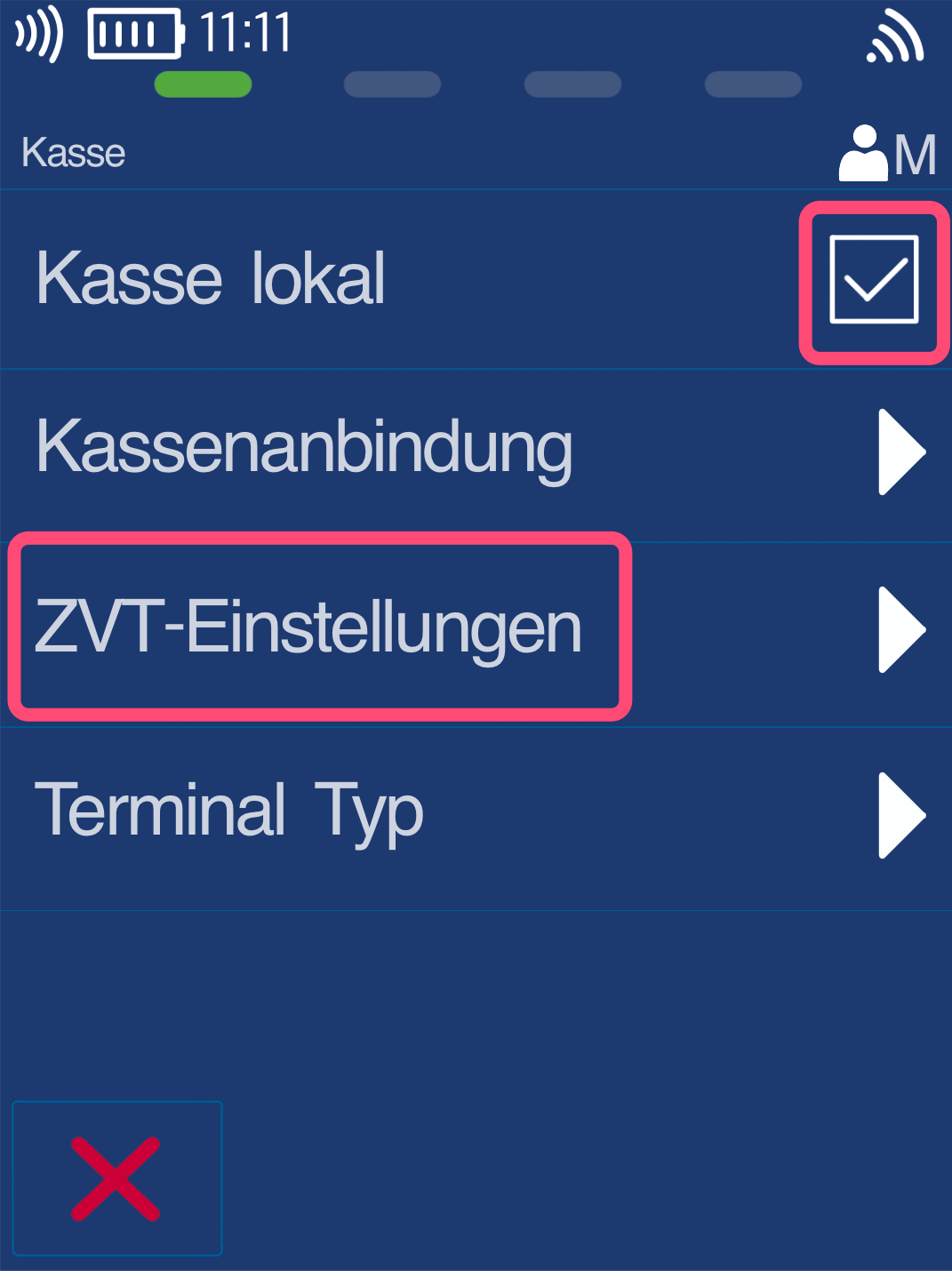Abb. 1 - Bitte entfernen Sie das Häkchen bei Kasse lokal durch Antippen.