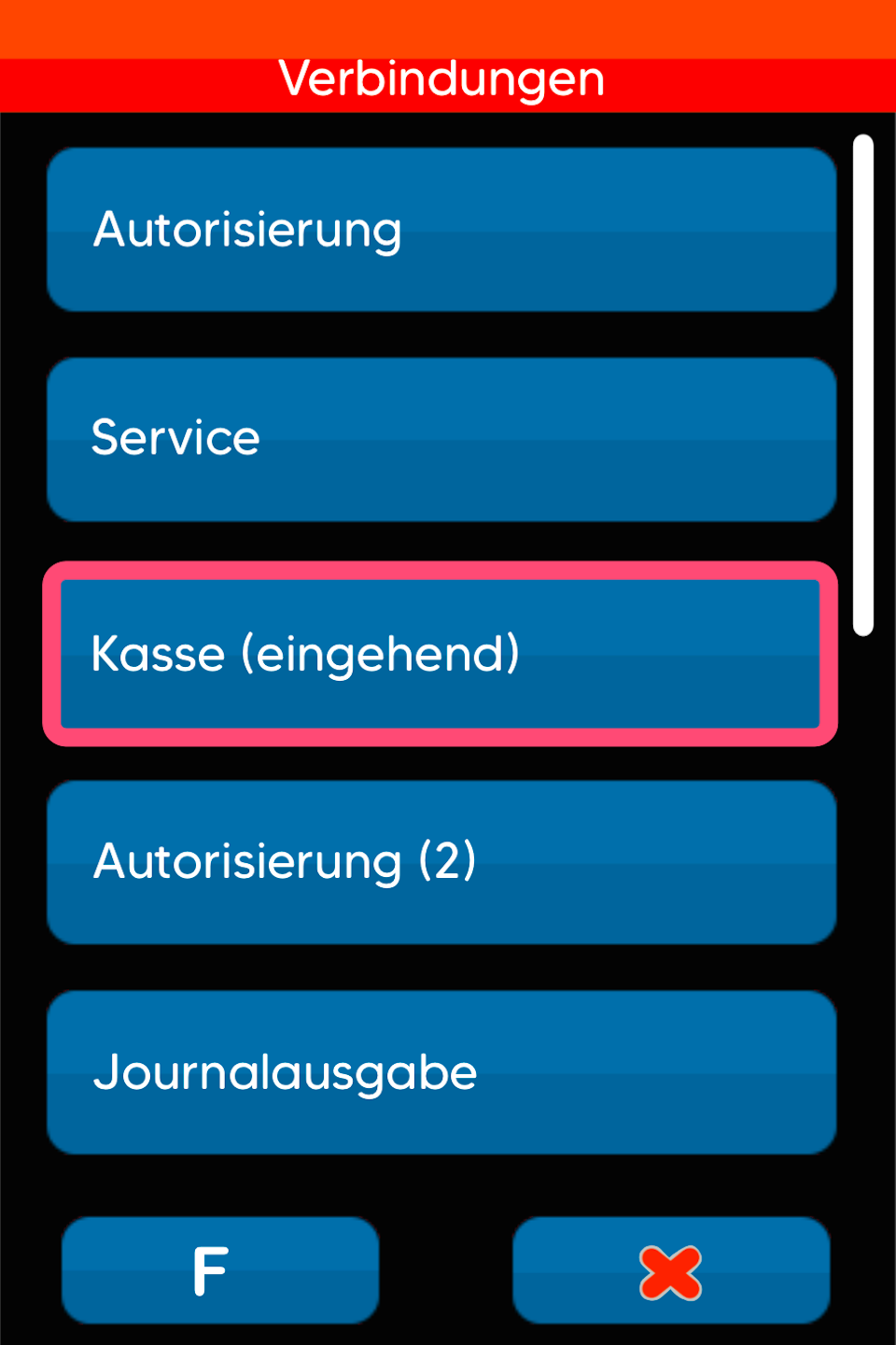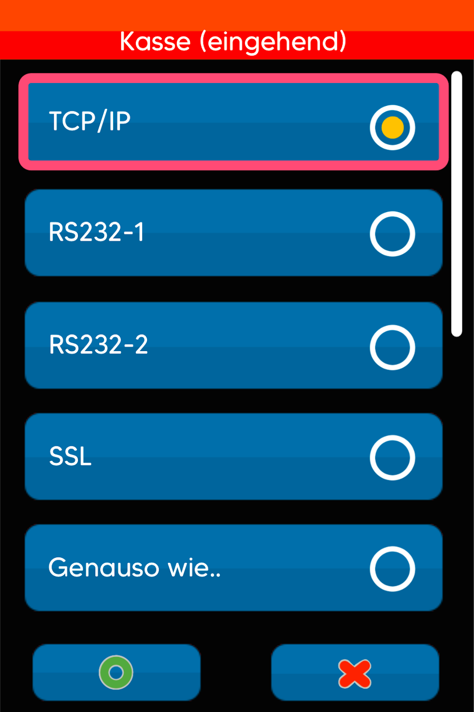 An dieser Stelle können Sie das Kassenprotokoll auswählen (Abb.1-2), das von Ihrem Kassensystem genutzt wird. Bestätigen Sie bitte die Auswahl durch Antippen und Drücken der grünen OK Taste.