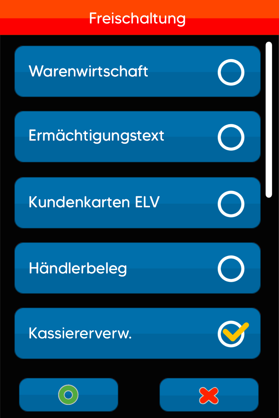 Durch Antippen des Menüpunktes Kassiererverwaltung wird dieser aktiviert. Bitte bestätigen Sie danach die Auswahl mit der grünen OK Taste.