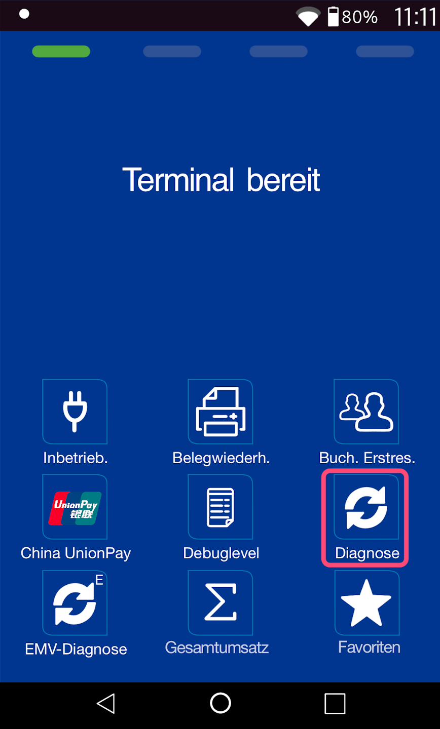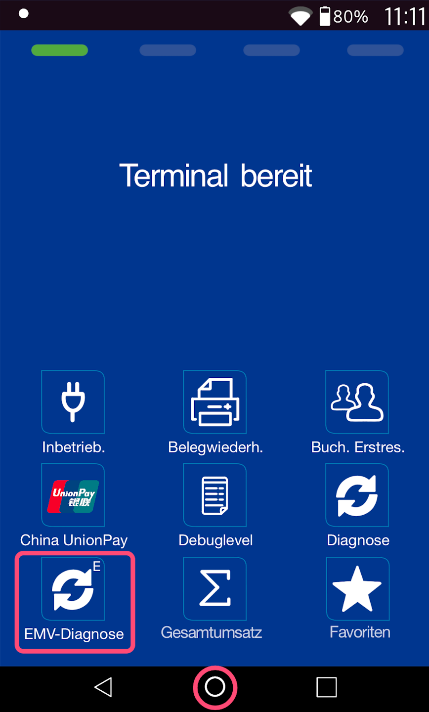Bitte wählen Sie die EMV-Diagnose aus und geben Sie Ihren 6-stelligen Kassierer-PIN ein.