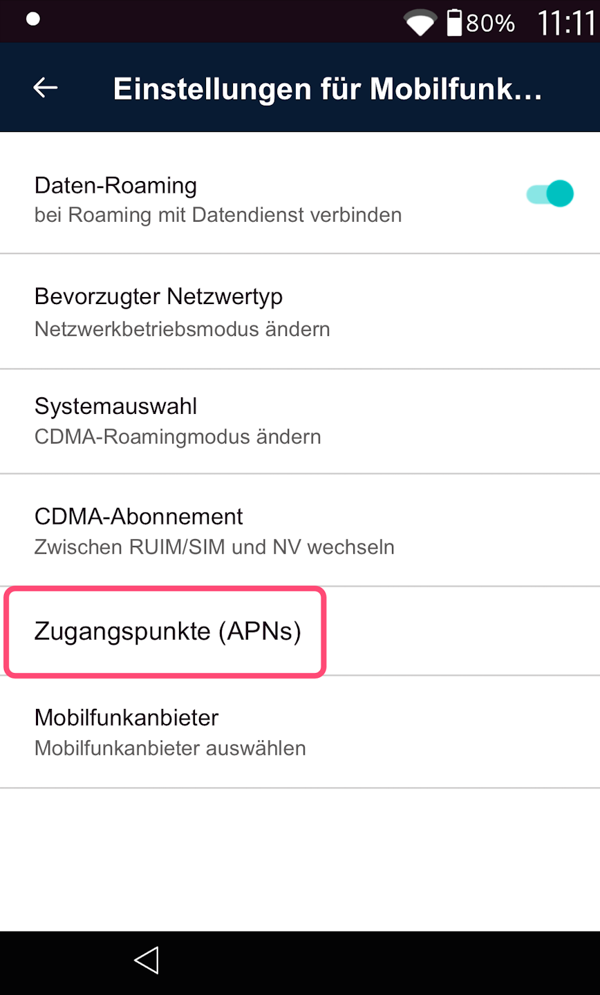Abb. 1 - Bitte tippen Sie die Zugangspunkte (APNs) an. Hier legen wir nun fest, über welchen Zugangspunkt sich die SIM-Karte einloggt. Wie in Abb. 2 zu sehen, tippen Sie bitte oben rechts das Plussymbol an.