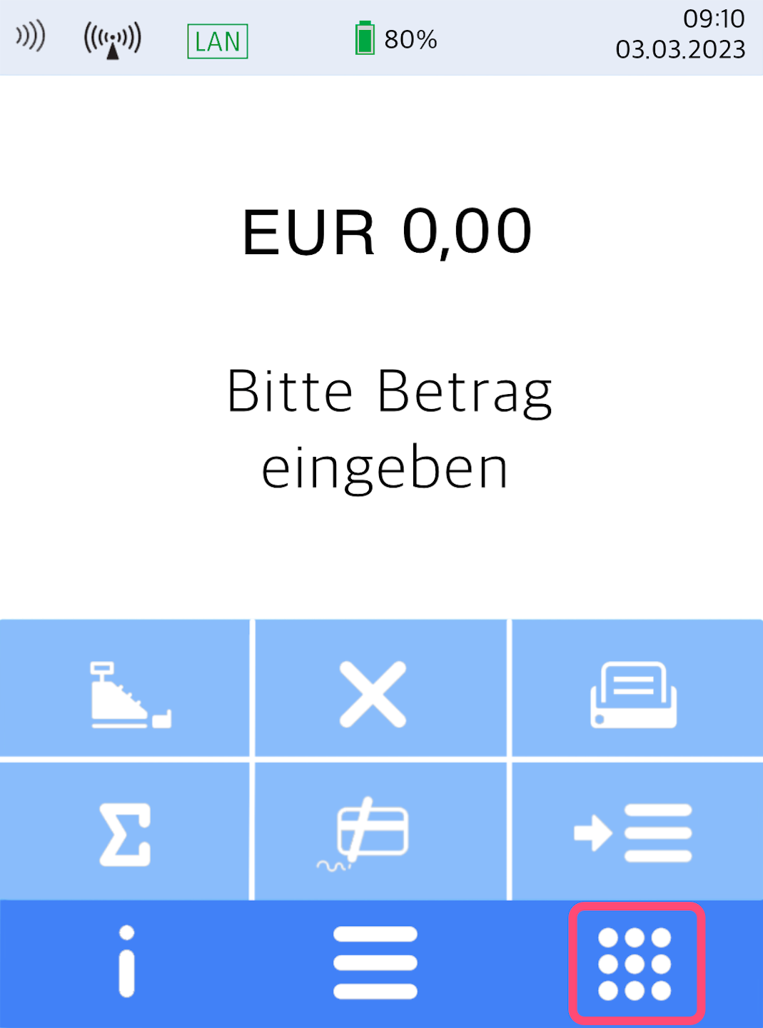 Sie sehen Ihr Ausgangsdisplay. Unten rechts befindet sich ein Button mit neun weißen Punkten, die Geschäftsvorfälle.