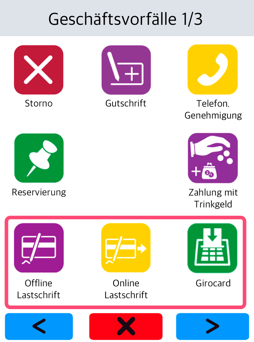 Die Geschäftsvorfälle können nur ohne Kassenanbindung genutzt werden. Mit einer Kassenanbindung steht Ihnen diese Funktion an Ihrem Kartenlesegerät nicht zur Verfügung. Bitte sprechen Sie dazu Ihren Kassenanbieter an.