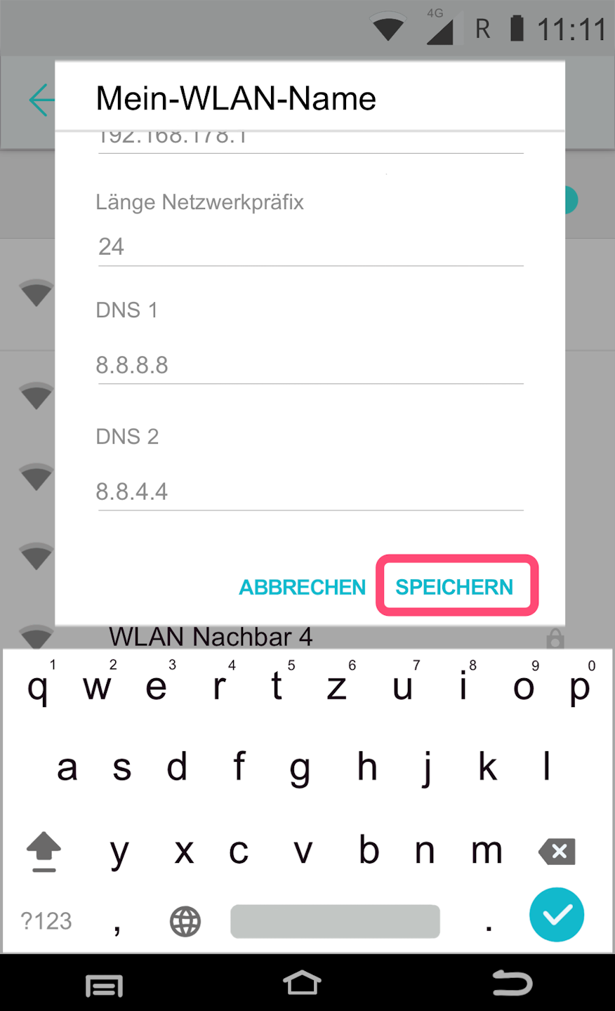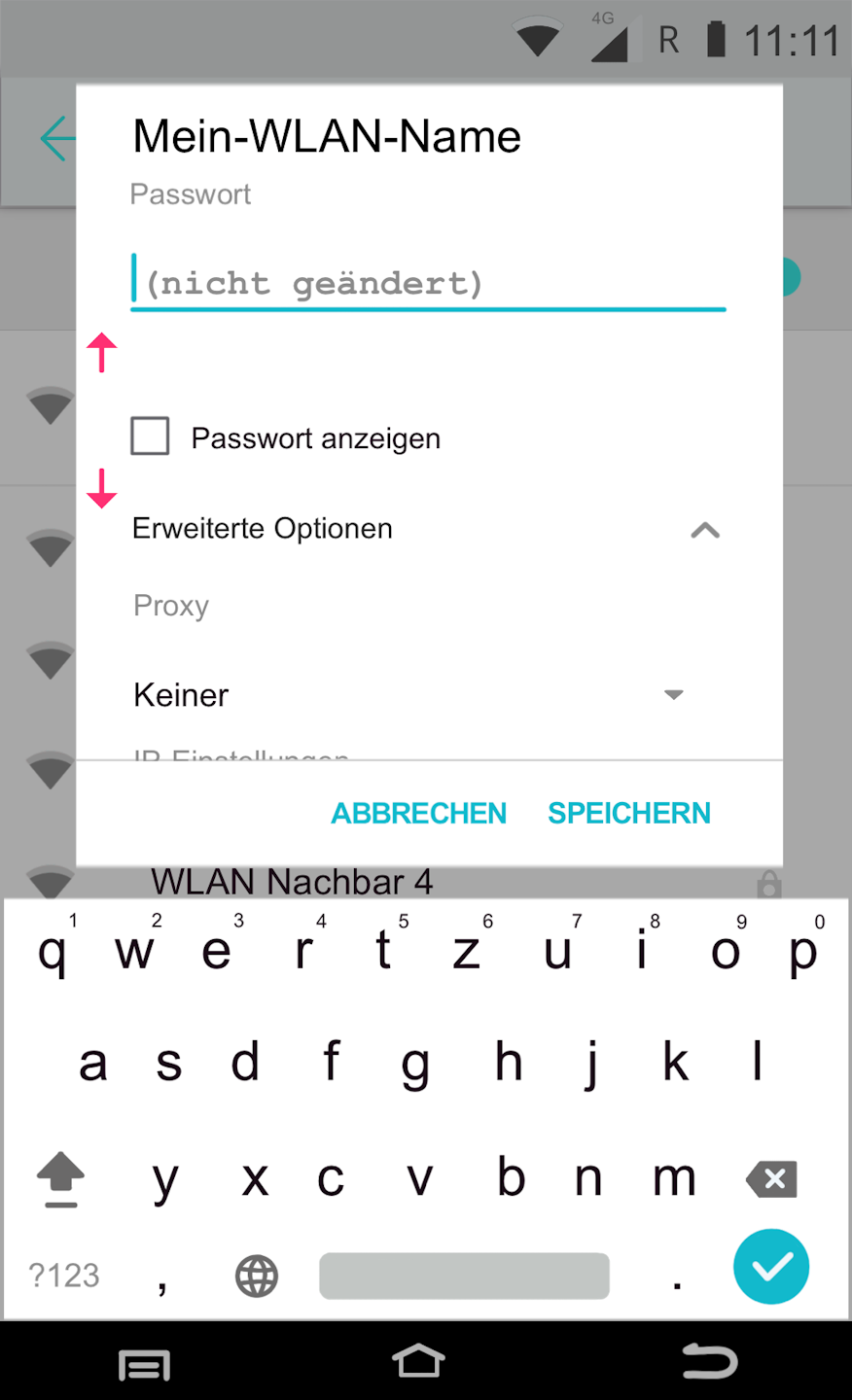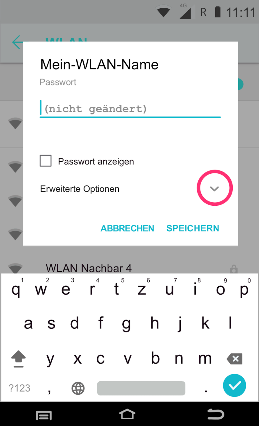 Im nächsten Schritt tippen Sie bitte Ihren WLAN-Netzwerknamen länger an, um das erweiterte Menü einzusehen.