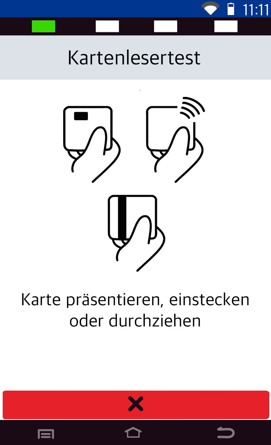 Wenn Sie den Kartenlesertest abbrechen möchten, drücken Sie bitte die rote X-Taste.