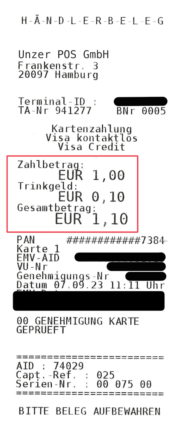 In Abb. 3 sehen Sie einen Händlerbeleg. Dort wird das Trinkgeld ausgewiesen.
