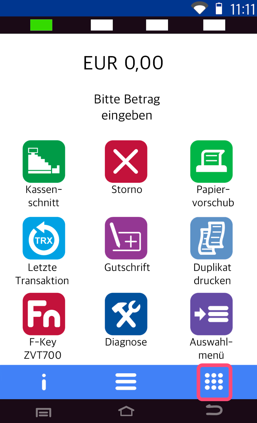 Bitte drücken Sie unten rechts auf den Button mit den 9 Punkten für die Geschäftsvorfälle.