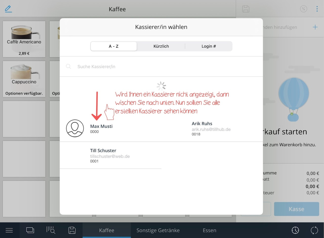 Alternativ können Sie auch oben rechts das Drei-Punkt-Menü öffnen und anschließend auf "Kassierer/in wechseln" tippen.