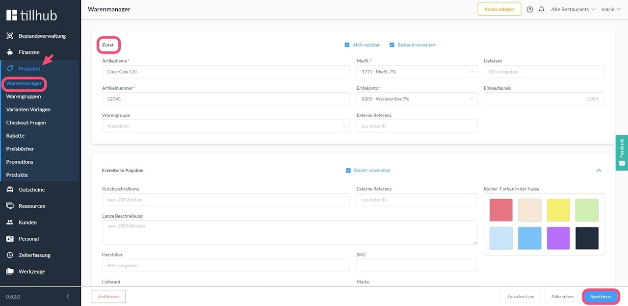 Navigieren Sie anschließend zu Warenmanager und klicken Sie auf den Reiter Zutat.