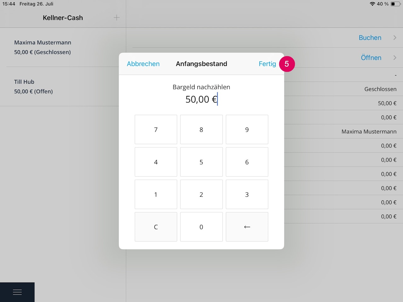 Nun können Sie den Anfangsbestand eines Kellner-Cashkontos eingeben.