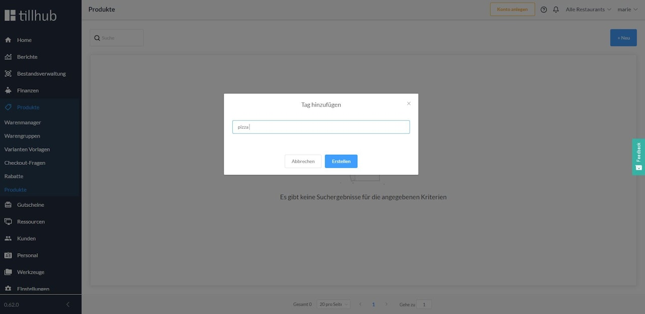 In dem Moment, in dem der Kassierer eine Bestellung aufgibt, drucken die Küchendrucker die Küchenbelge mit den ihnen zugewiesenen Produkten aus. Um Tags zu erstellen, klicken Sie im Hauptmenü auf Produkte und navigieren Sie zu im Untermenü ebenfalls zu Produkte. Über den Button +Neu können Sie die verschiedenen Tags erstellen.