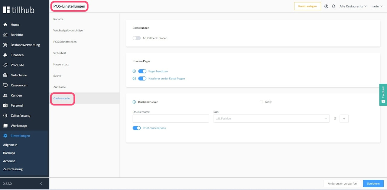 Navigieren Sie anschließend im Untermenü zu POS, um die Option "Gastronomie" auszuwählen. Hier können Sie Küchendrucker aktivieren, deaktivieren, konfigurieren und ihnen verschiedene Tags zuweisen.