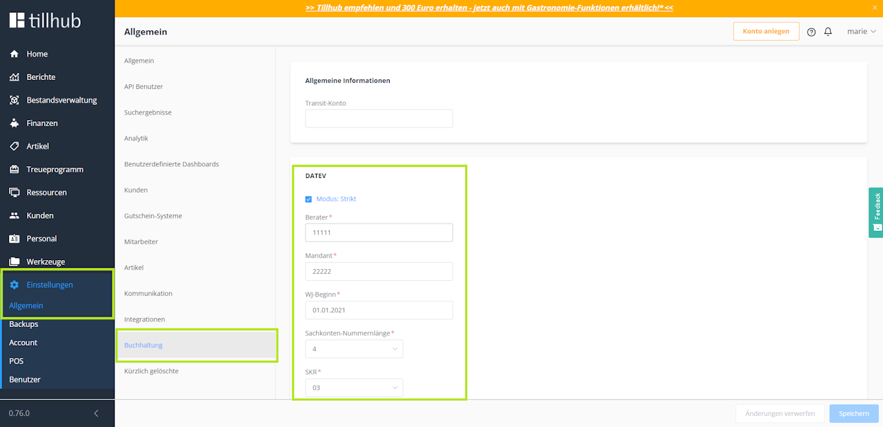 Navigieren Sie links im Menü zu "Einstellungen" und anschließend im Untermenü zu "Allgemein". Klicken Sie dann rechts im Bild auf "Buchhaltung". Oben rechts haben Sie im leeren Feld mit dem Titel "Transitkonto" die Möglichkeit, Ihr nicht ergebniswirksames Konto für das interne Transitkonto des Tillhub-Kassensystems einzugeben.
