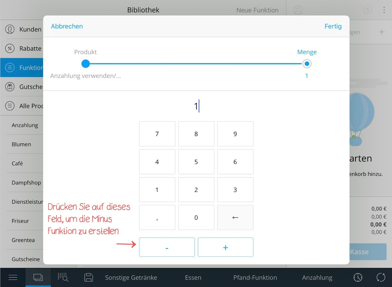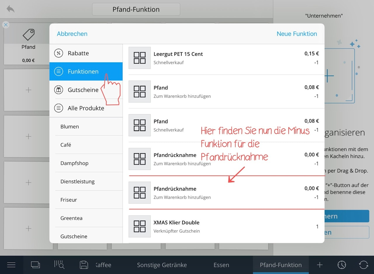 Wählen Sie rechts im Bild die in Schritt 2 erstellte Minus-Funktion für die Pfandrücknahme aus