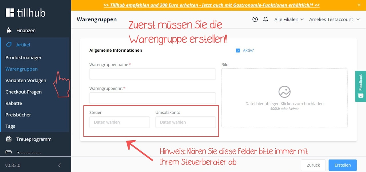 Erstellen Sie im Menü Artikel > Warengruppen eine Warengruppen namens "Anzahlung" an. Klären Sie vorab mit Ihrem Steuerberater, welche Steuer- und Erlöskonten Sie in den Feldern "Steuer" und "Umsatzkonto" hinterlegen sollen.