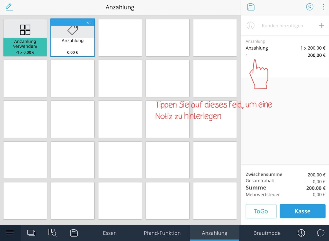 Drücken Sie nun auf die Funktion "Anzahlung einlösen"