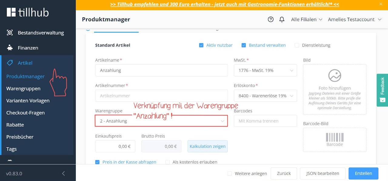 Verknüpfen Sie die beiden Artikel mit der Warengruppe "Anzahlung".