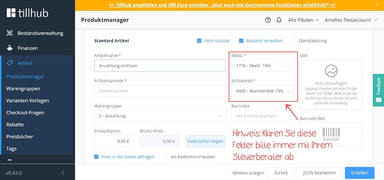 Erstellen Sie im Produkt-Manager zwei Artikel, die Sie "Anzahlung" und "Anzahlung verwenden/einlösen" nennen mit den entsprechenden Beträgen und dem erforderlichen MwSt.-Satz.