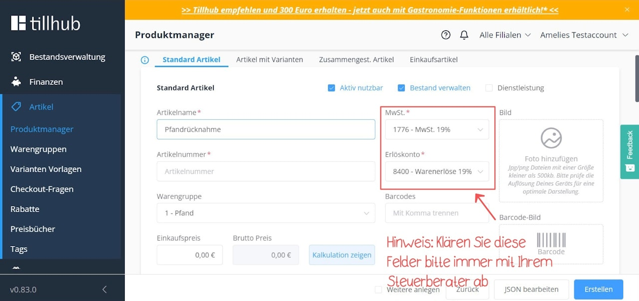 Erstellen Sie im Menü Artikel > Warengruppen eine Warengruppen namens "Pfand" an. Klären Sie vorab mit Ihrem Steuerberater, welche Steuer- und Erlöskonten Sie in den Feldern "Steuer" und "Umsatzkonto" hinterlegen sollen