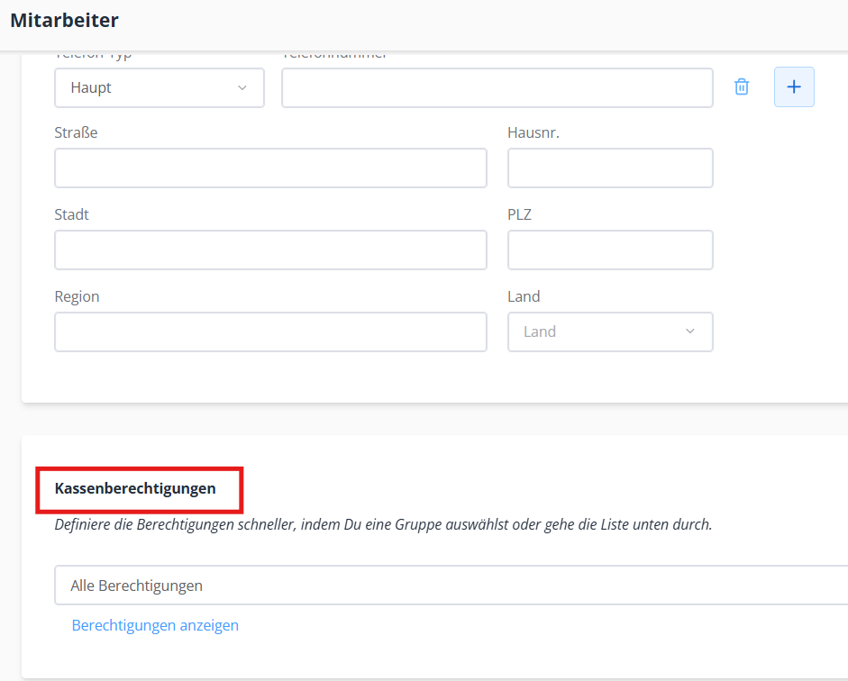 - Alle weiteren Felder ohne Sternchen sind optional und können bei Bedarf ausgefüllt werden. Befugnisse & Kassenberechtigungen