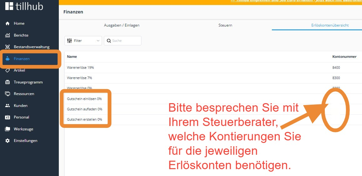 - In der Regel empfehlen wir, für jede der drei Gutschein-Aktionen ein eigenes Erlöskonto mit einer eigenen Kontierung im Menübereich "Finanzen/Erlöskontenübersicht" anzulegen: