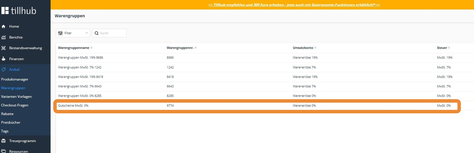Legen Sie im "Produktmanager/Warengruppen" eine Warengruppe namens "Gutscheine" an. Verknüpfen Sie diese mit dem jeweiligen Erlös- und Steuerkonto.