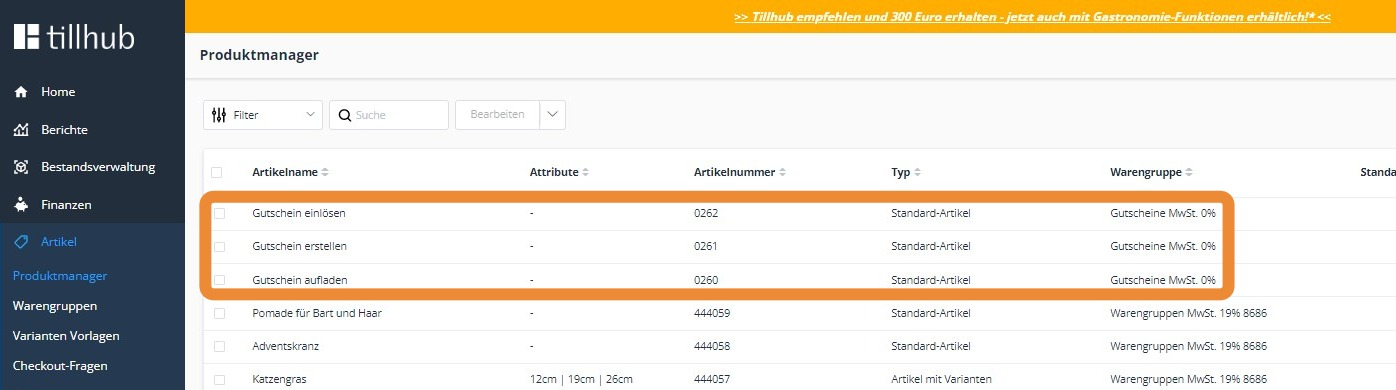 Fügen Sie der Warengruppe drei Artikel hinzu, die die Namen der einzelnen Gutschein-Aktionen tragen: