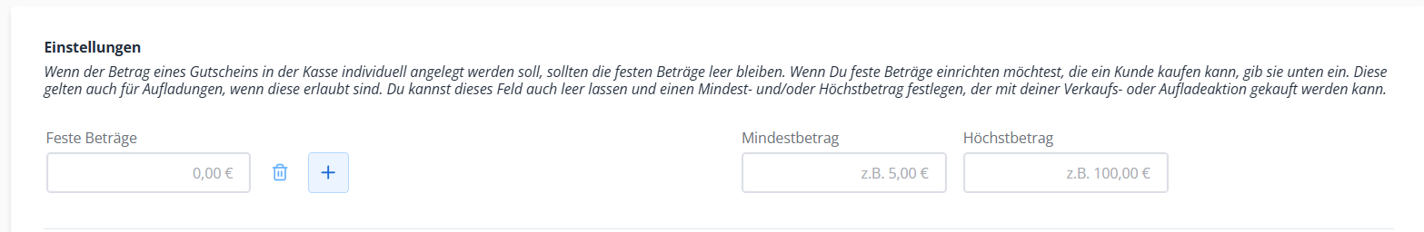 Wenn der Betrag eines Gutscheins in der Kasse individuell angelegt werden soll, sollten die festen Beträge leer bleiben. Wenn Sie feste Beträge einrichten möchtest, die ein Kunde kaufen kann, geben Sie sie unter "Feste Beträge" ein. Diese gelten auch für Aufladungen, wenn diese erlaubt sind.