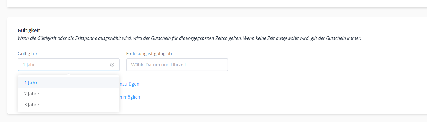 In den "Einstellungen" Ihres Gutscheinsystems haben Sie die Möglichkeit, die Gültigkeit Ihres Gutscheinsystems auf 1, 2 oder 3 Jahre zu beschränken.