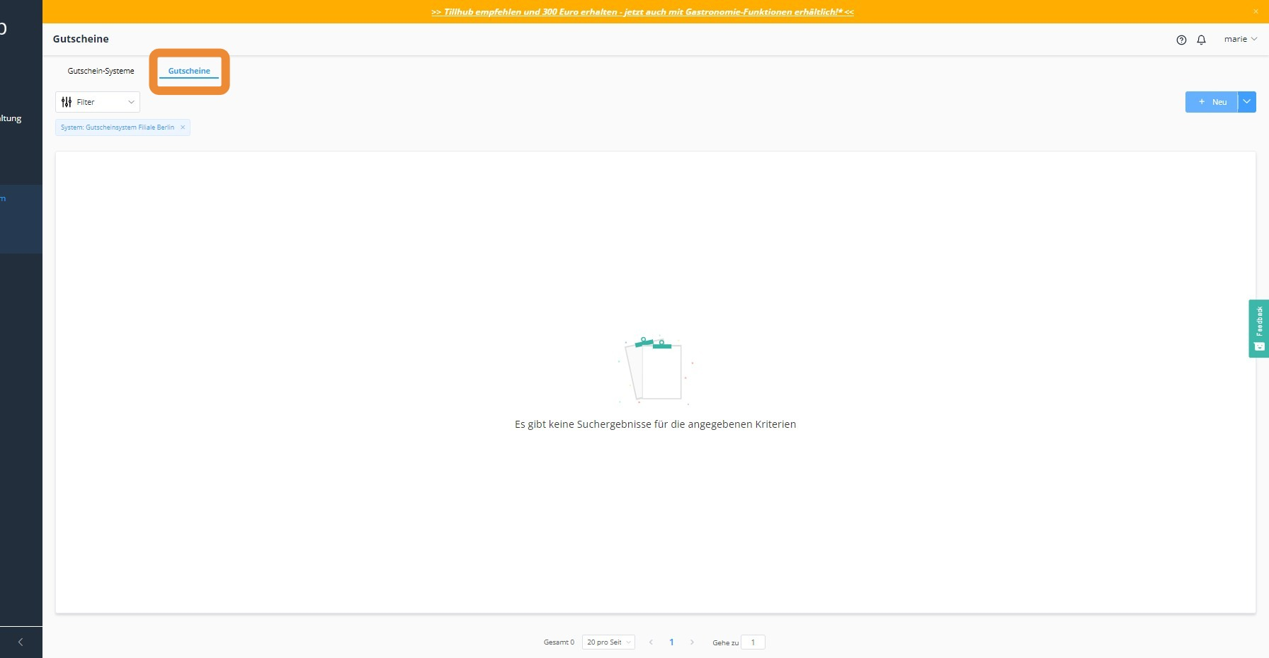 Um ein neues Gutscheinsystem im Dashboard einzurichten, klicken Sie zunächst auf den Menüpunkt Treueprogramm und anschließend auf Gutscheinsystem. Über „+ Neu“ erstellen Sie ein neues System.