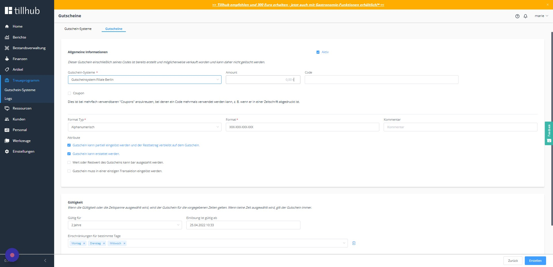 Zum Abschluss klicken Sie auf „Erstellen“, um den Gutschein im System zu speichern.