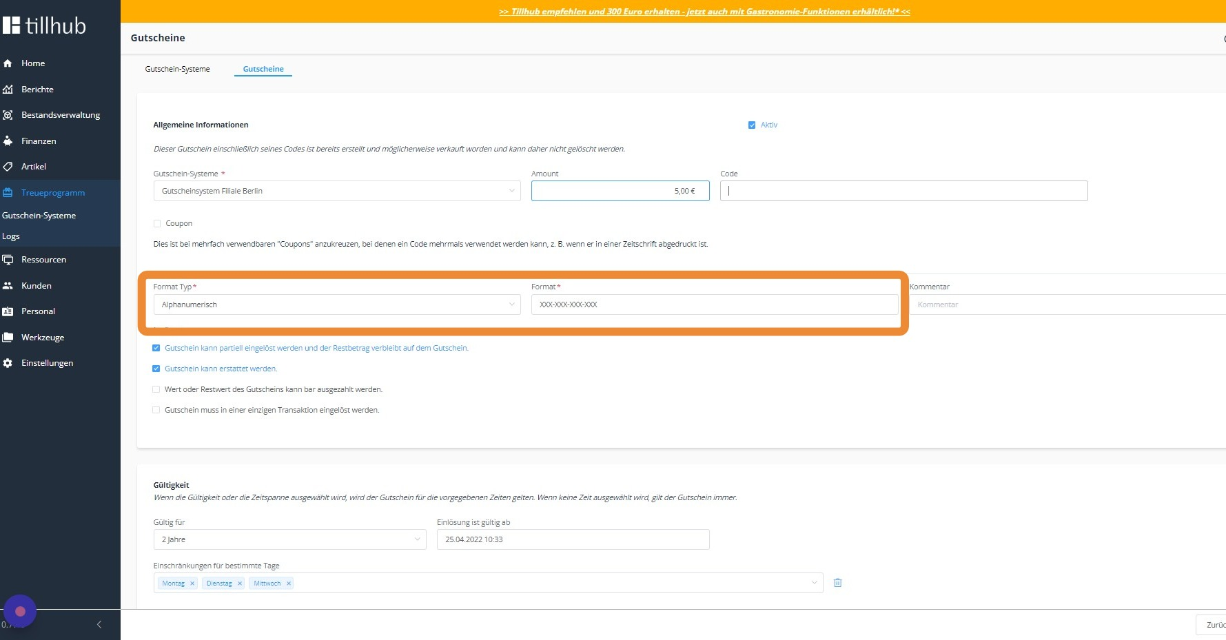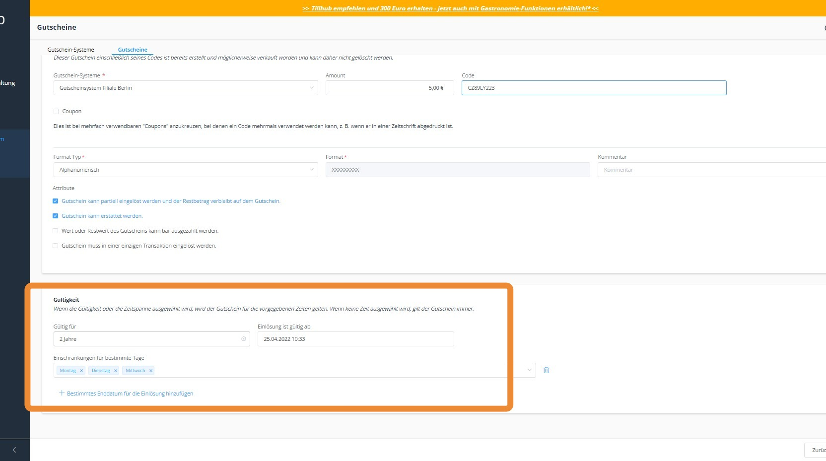 In den nächsten Schritten zeigen wir Ihnen, welche Einstellungen Sie bezüglich der Gültigkeit Ihres Gutschein-Systems vornehmen können.