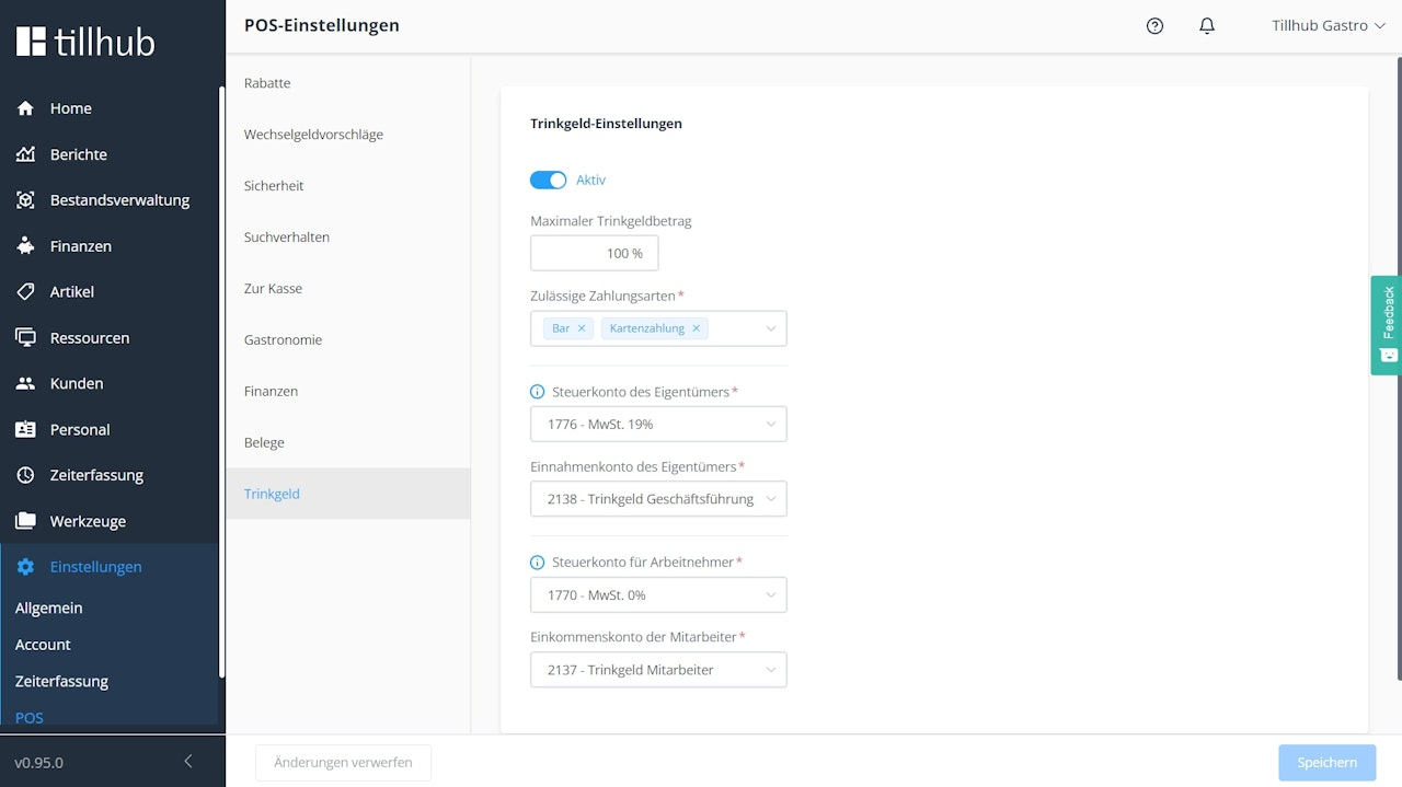 Für die technische Umsetzung der Aktivierung ist es für Geschäftsführende notwendig, ein Erlöskonto anzugeben, selbst wenn sie nicht an der Einnahme von Trinkgeldern beteiligt sind.